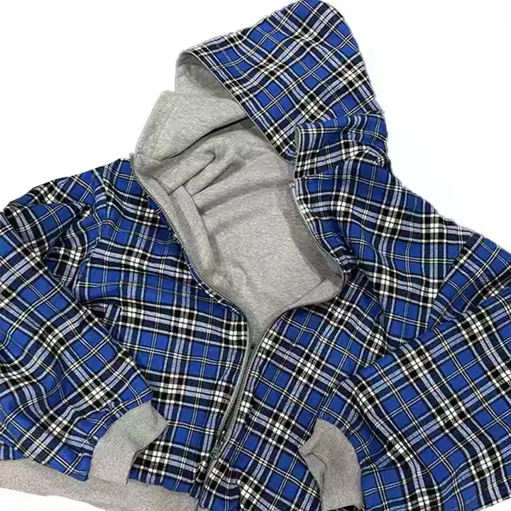 OEM Custom Retro Checkered Patchwork Design Cardigan Reversible Hoodie Sweatshirt Men’s Oversized Street Zip up Hoodie