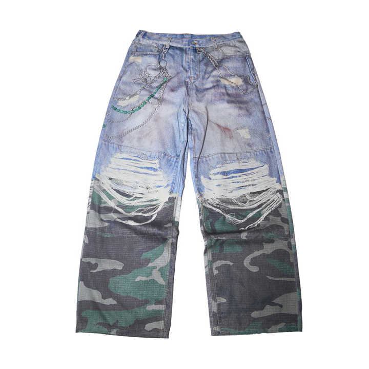Custom Vintage Distressed Baggy Men’s Jeans Full Digital Print Patchwork Camouflage Light Straight Denim Pants