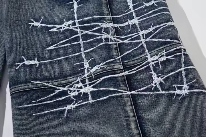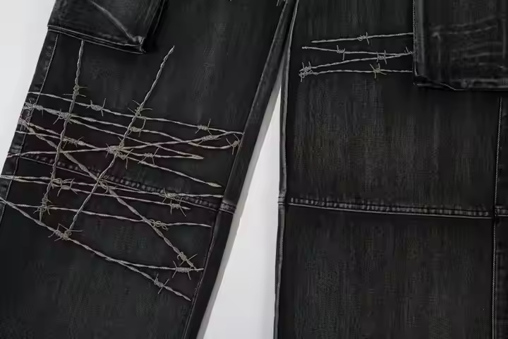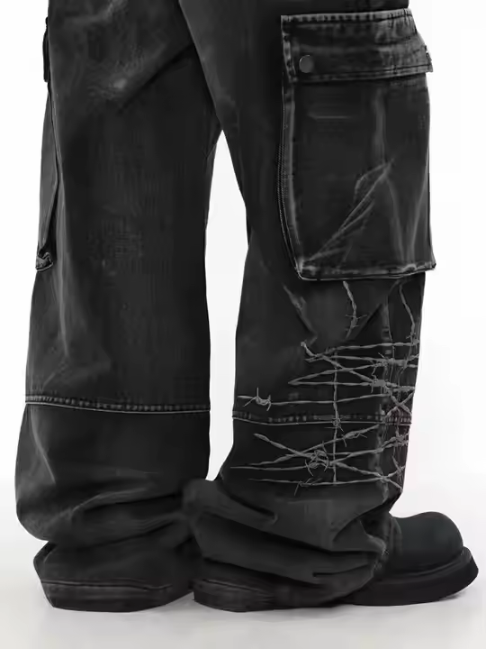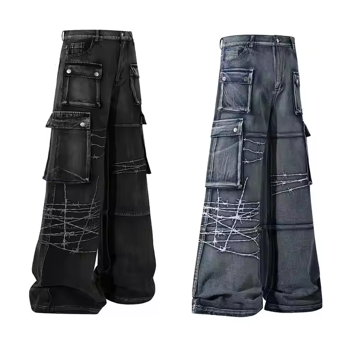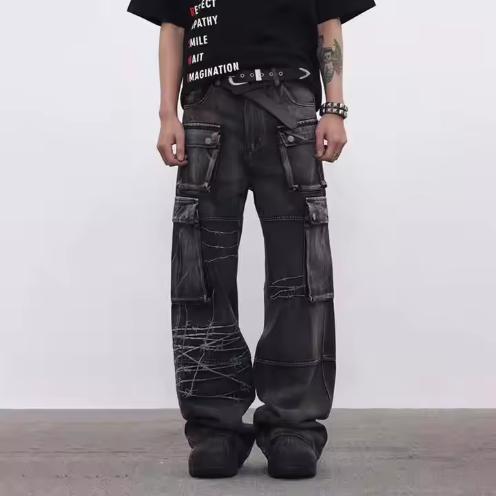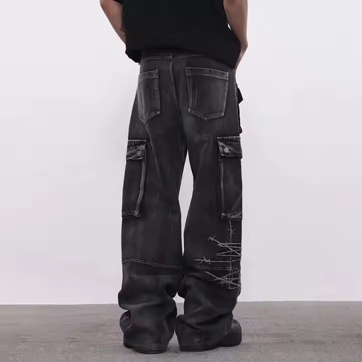 Vintage Floral Embroidery Men’s High Straight Denim Cargo Pants Custom Factory Fashion Trendy Multi-Pockets Diamond for Winter